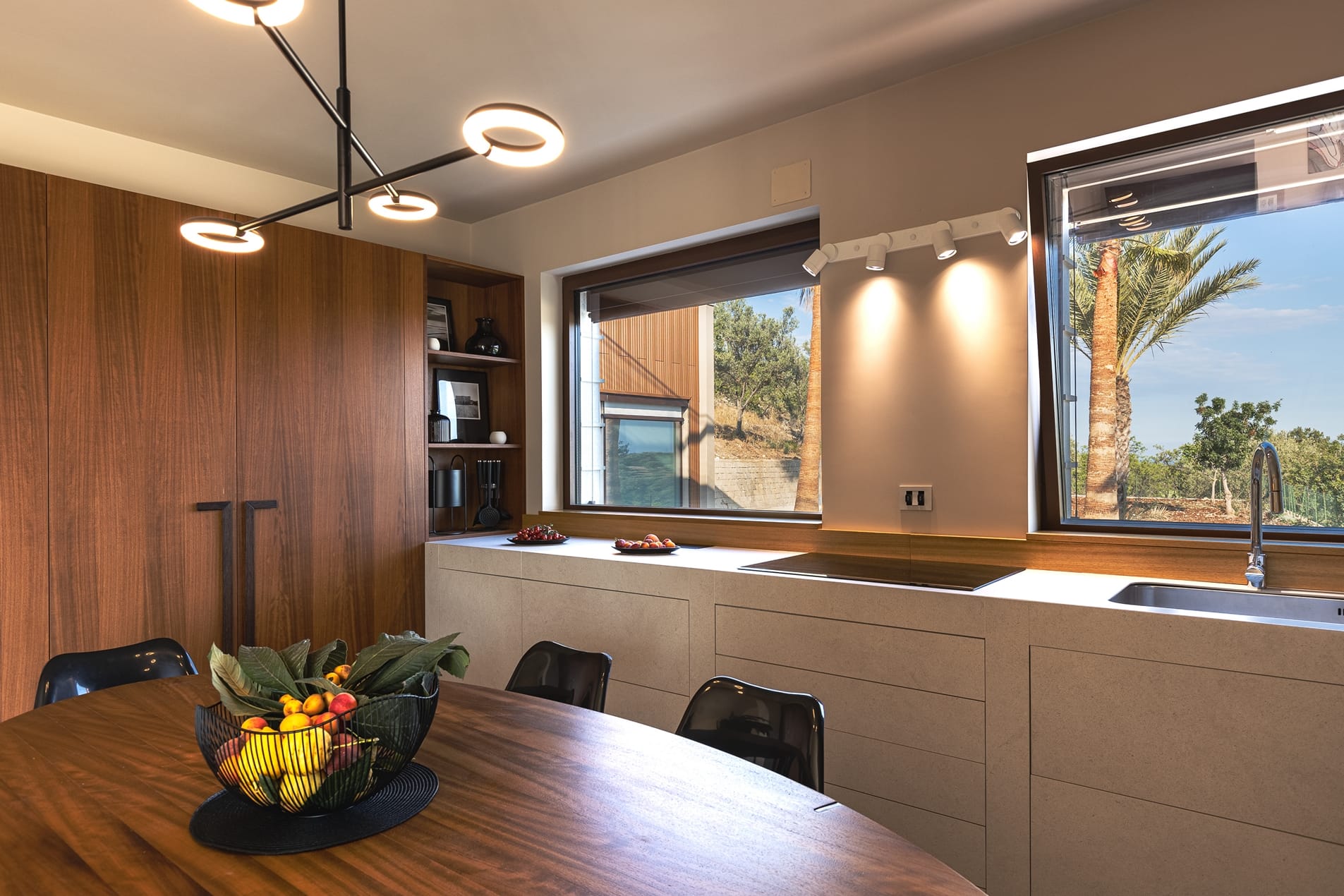 Nell’ampia zona living, il divano, rivestito in tessuto, invita a rilassarsi con un buon libro e una tazza di tè. La cucina adiacente, arredata con gusto, è un angolo di pura eleganza moderna ed in particolare l’ampio piano di lavoro è ideale per preparare deliziosi pasti con ingredienti freschi provenienti dai mercati locali. La luce naturale che filtra dalle finestre illumina il tavolo in legno massello e le sedie, rendendo l’ambiente luminoso e ospitale.