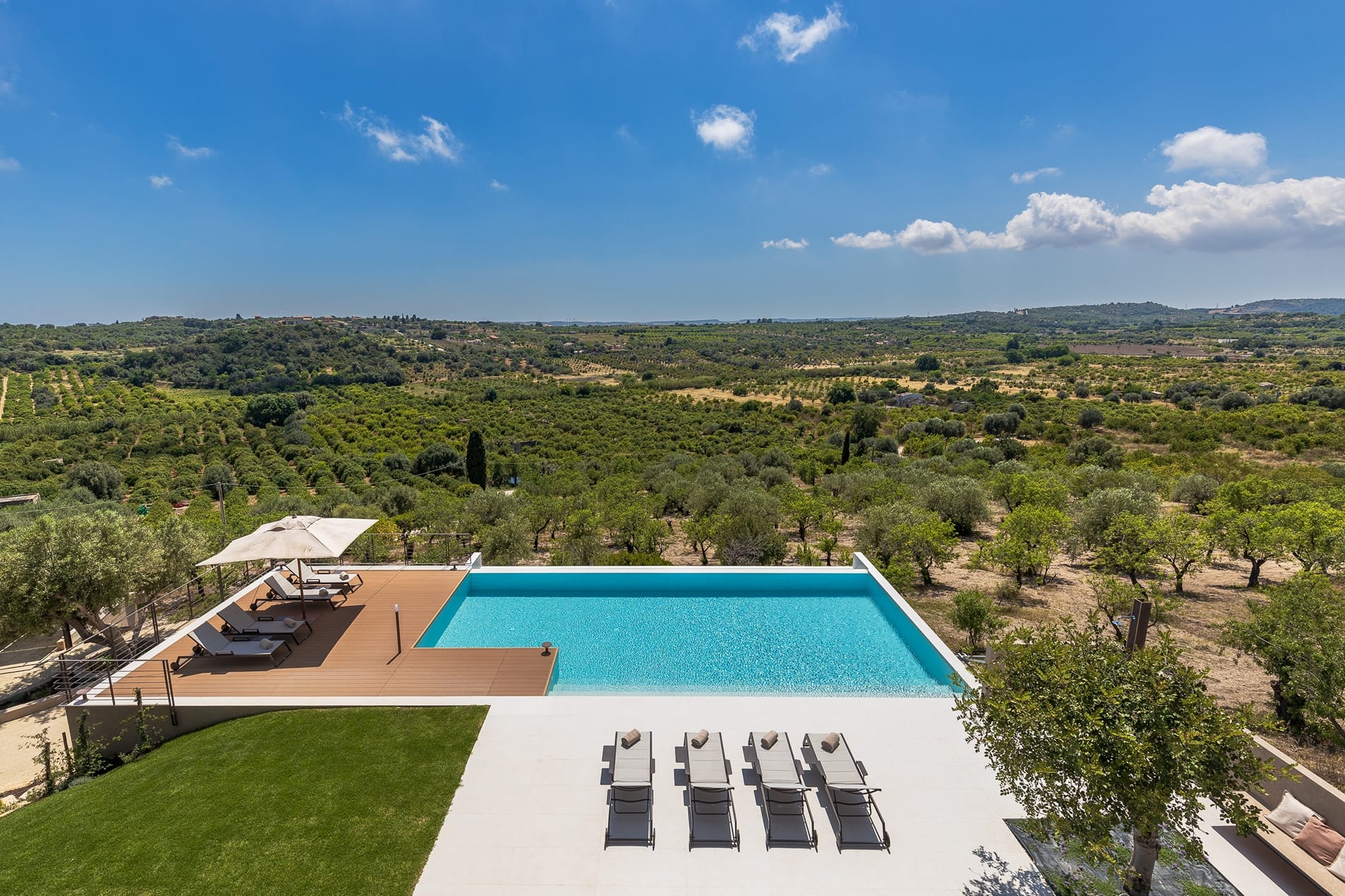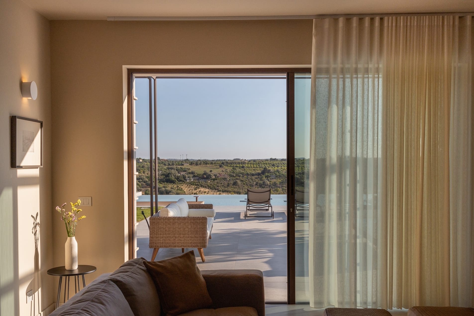 All’esterno, la piscina a sfioro offre indimenticabili momenti di relax. Il solarium attrezzato con comodi lettini prendisole e ombrelloni, è il luogo ideale per rilassarsi e godersi il panorama mozzafiato. Completa la proprietà un’ampia terrazza adiacente alla piscina, arredata con comodi divani e poltrone che, insieme al giardino curato nei minimi dettagli, sono il luogo perfetto per cene all’aperto e lunghe conversazioni immersi nella campagna siciliana.