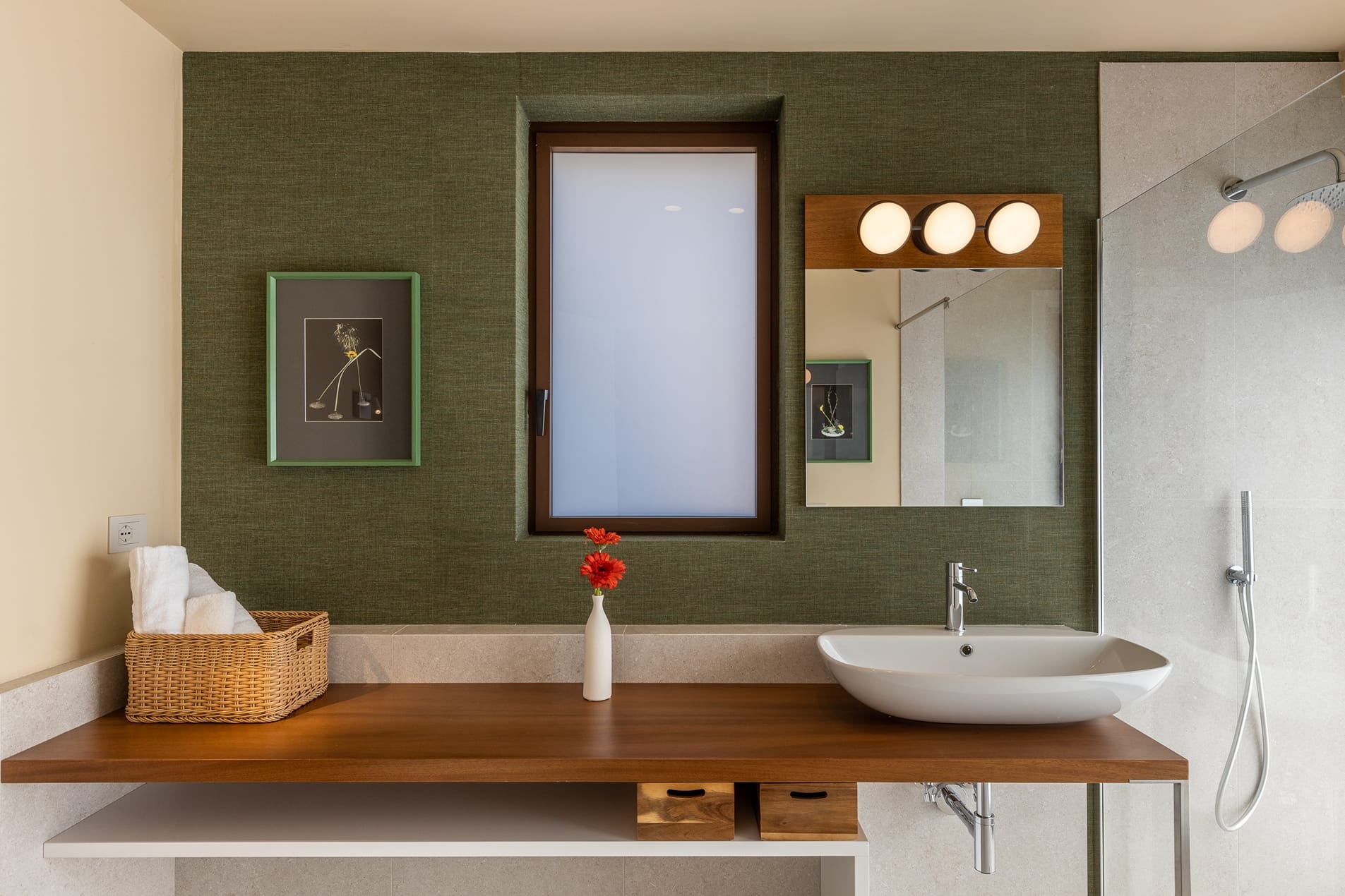 La suite più grande, situata al piano superiore e accessibile tramite una moderna scala interna, è di 40 mq ed è composta da due ambienti separati da una porta scorrevole: uno con divano letto, zona TV e bagno e l’altro con un comodo letto matrimoniale e scrivania.