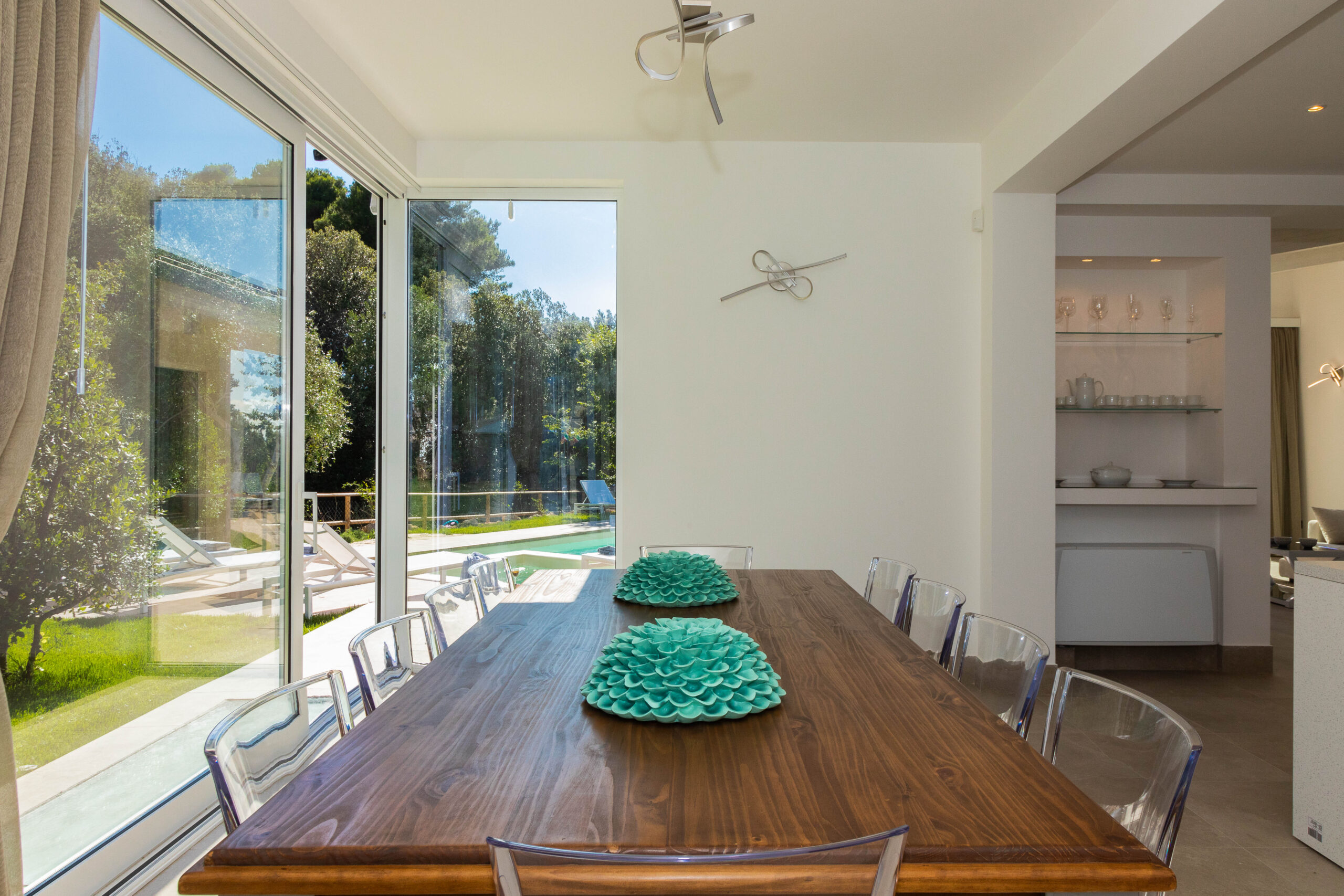 Entering the property, a very well-kept garden with green lawns leads to the pool and to the house entrance, all surrounded by small shrubs and plants typical of Mediterranean vegetation. The tranquility given by the private grove with its natural stream is also found in the exclusive services that the villa offers: the wonderful pool area with powerful Jacuzzi and counter-current swimming function, the sauna and the small oasis of relax created by the comfortable and modern outdoor furniture between the terraces and the garden in both floors.