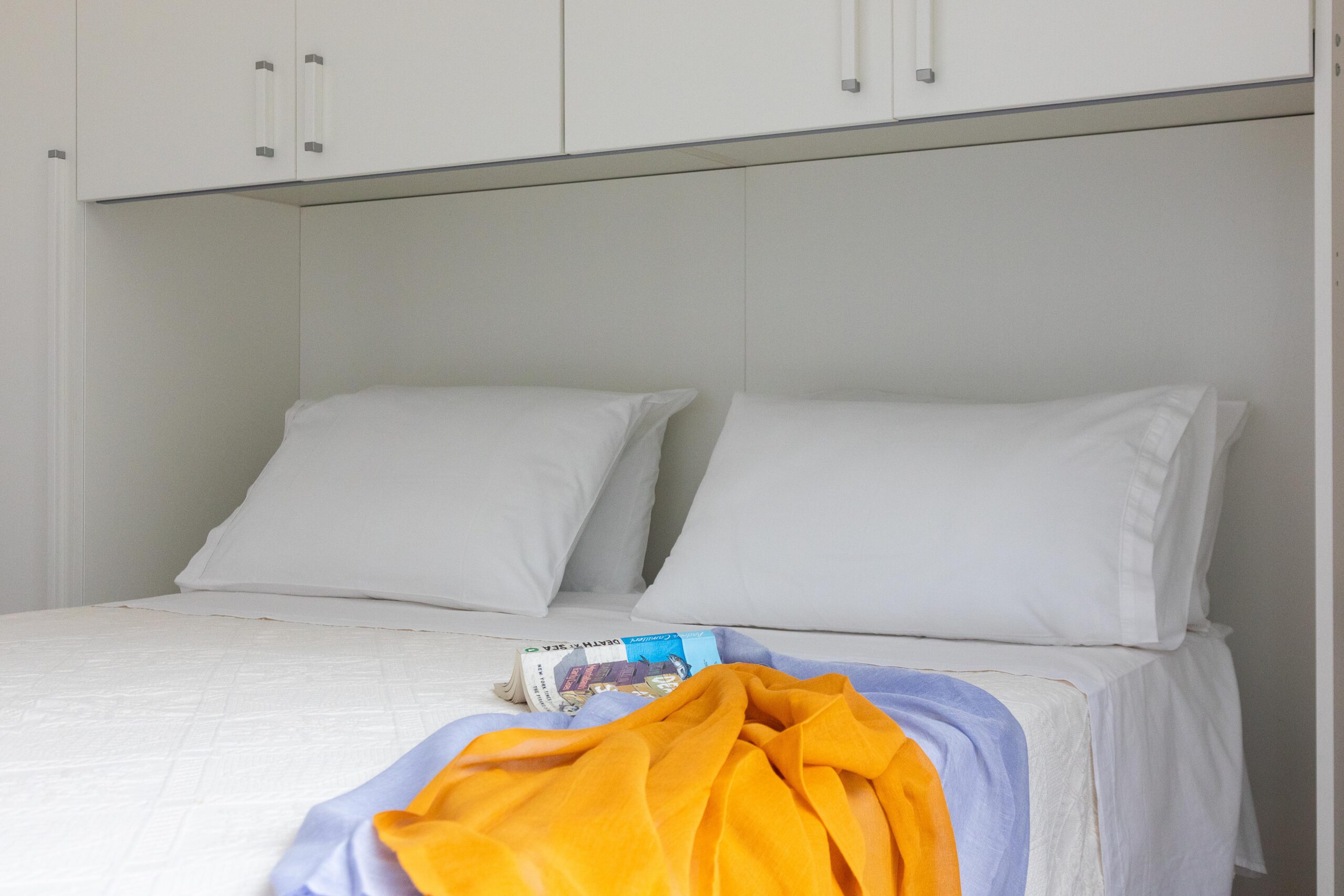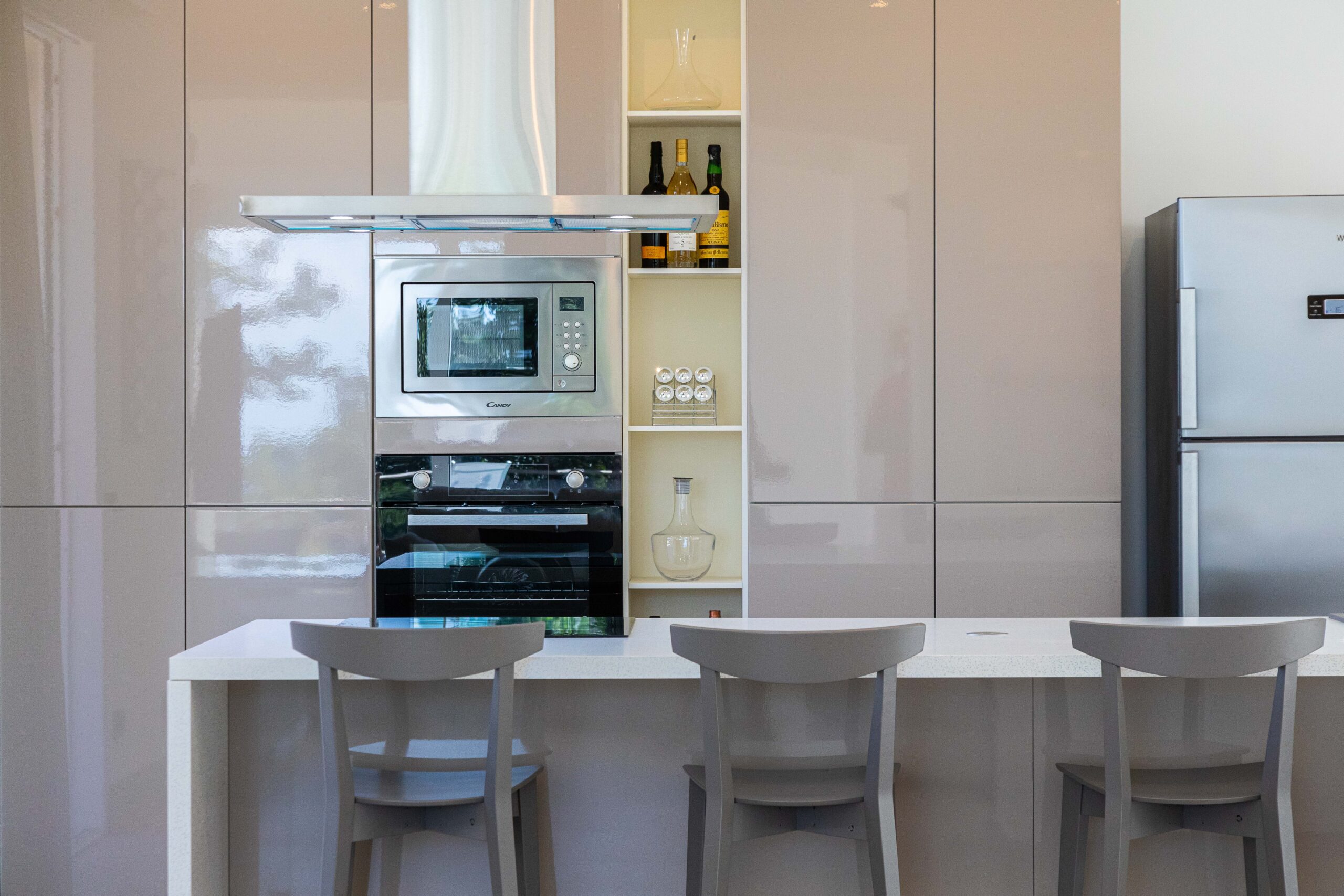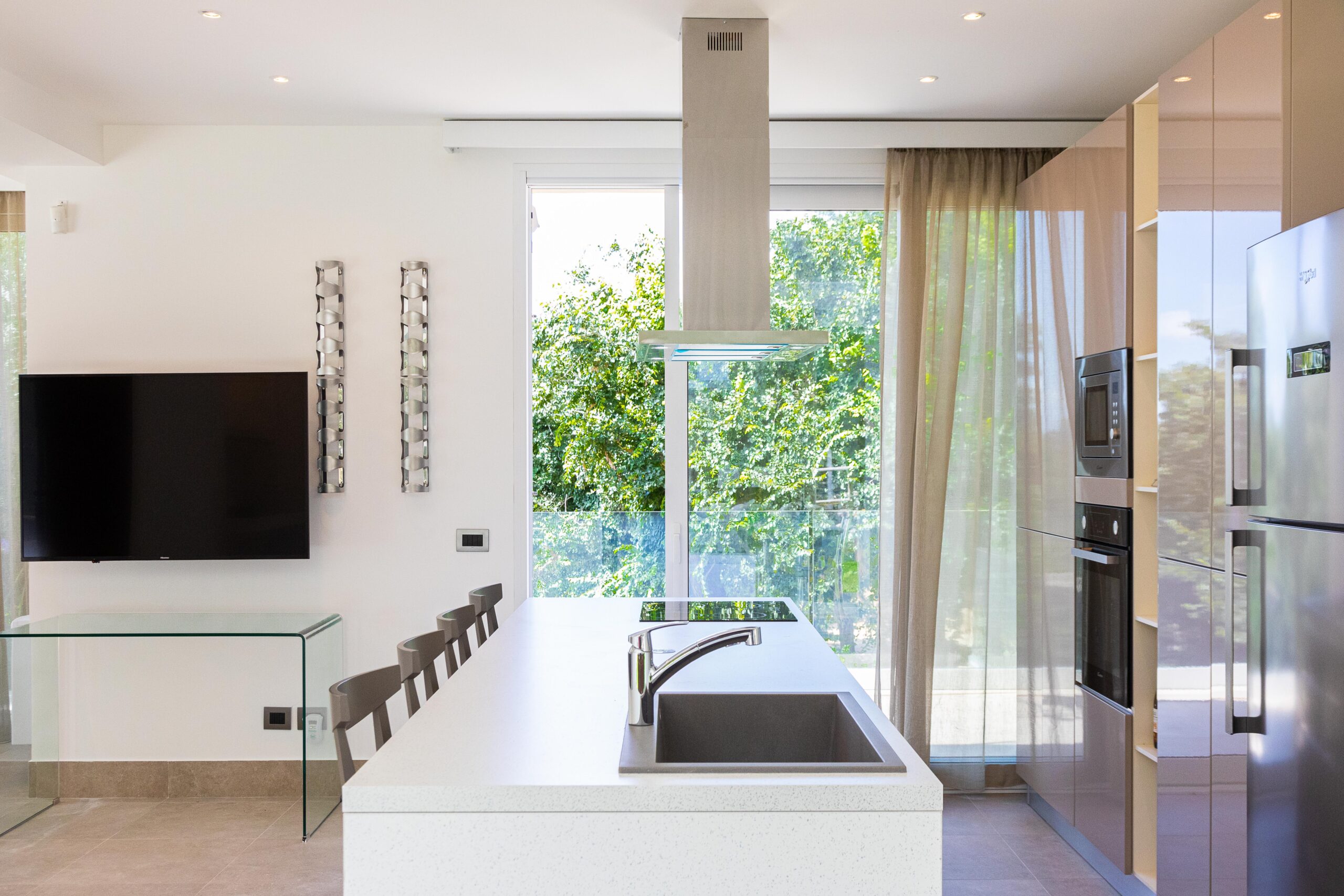 At the entrance, a bright modern open space welcomes you. It includes a large, fully equipped kitchen with island, a dining area and the relaxation area with comfortable sofas and TV.