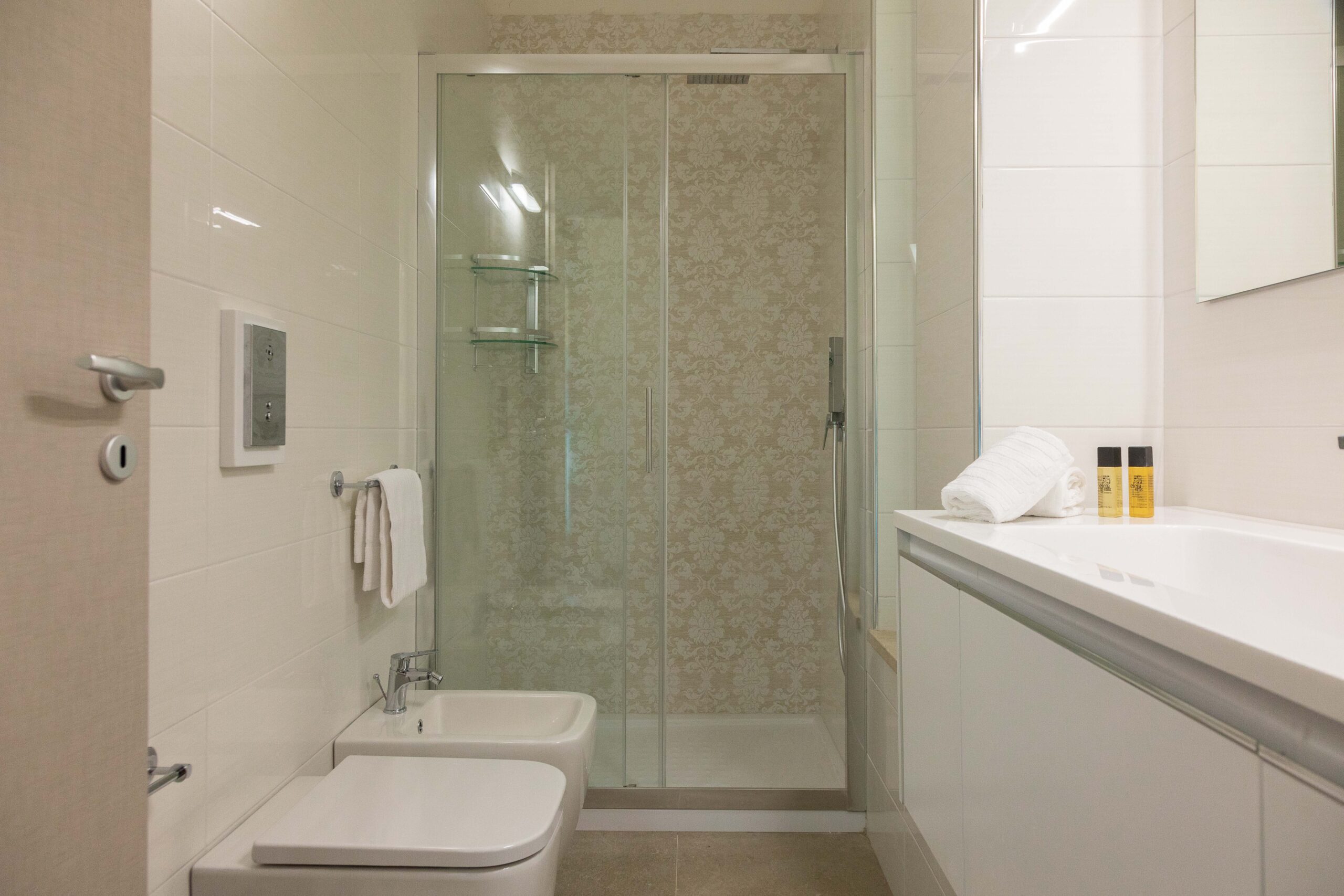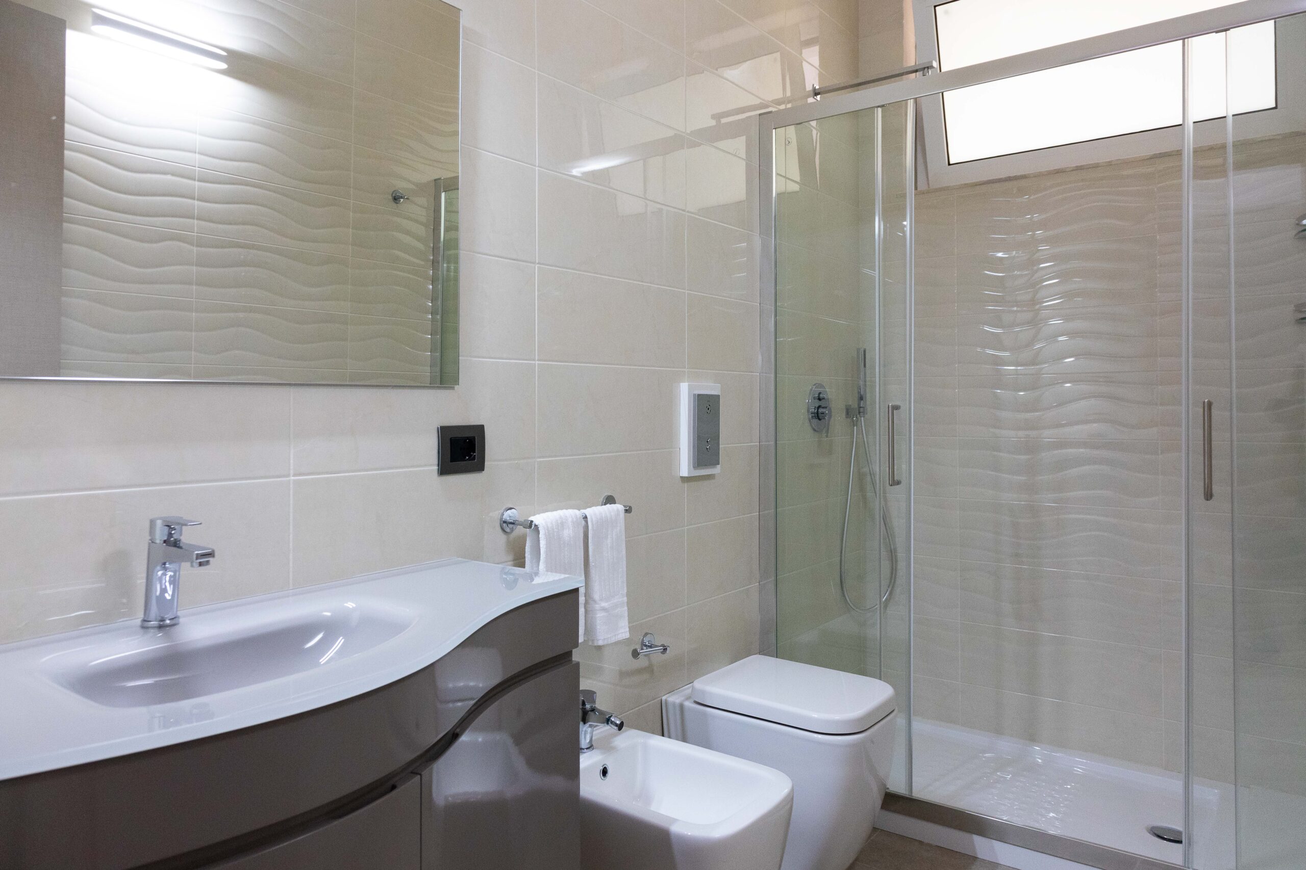 An interior contemporary design staircase leads to the lower level where there are three tastefully furnished bedrooms, all with comfortable ensuite bathrooms. The largest double bedroom has a skylight window which is not openable. The second bedroom has very pleasant french doors which open to the hallway and the terrace behind it. This solution makes the room very bright. The third bedroom has a wide window which opens to the very nice gardens of the lower floor.