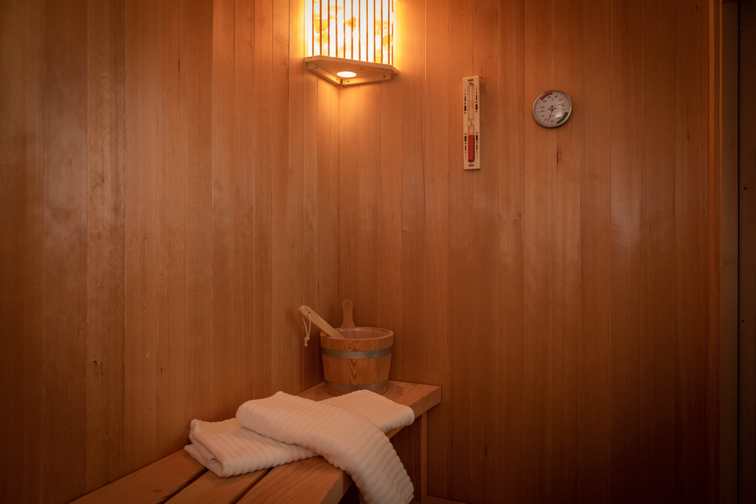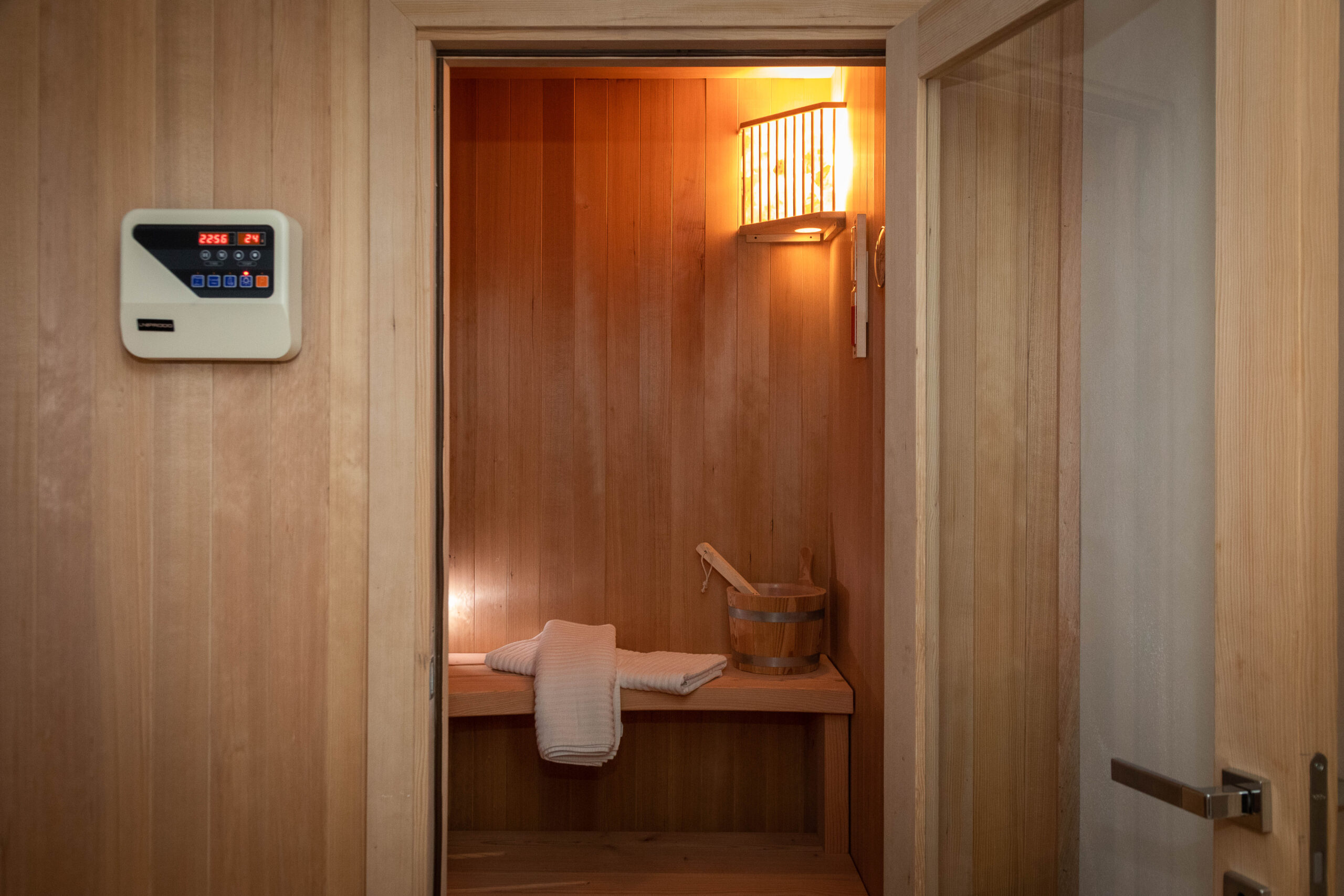 Just halfway between the two levels can be found the sauna, entirely wooden and complete with massage bed.