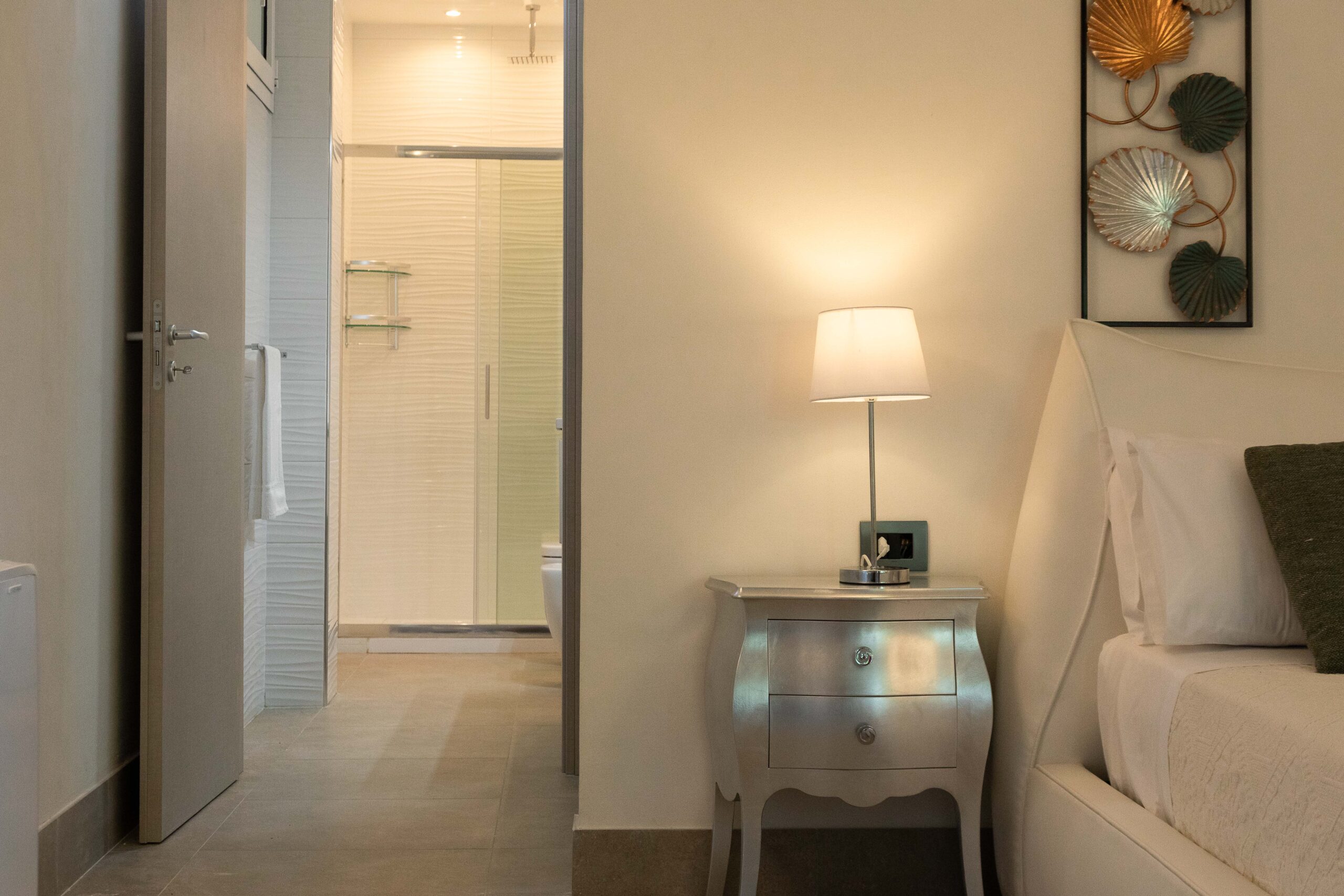 From the living zone, two double bedrooms with adjacent private bathrooms can be reached. One of the rooms opens to the outside terrace.